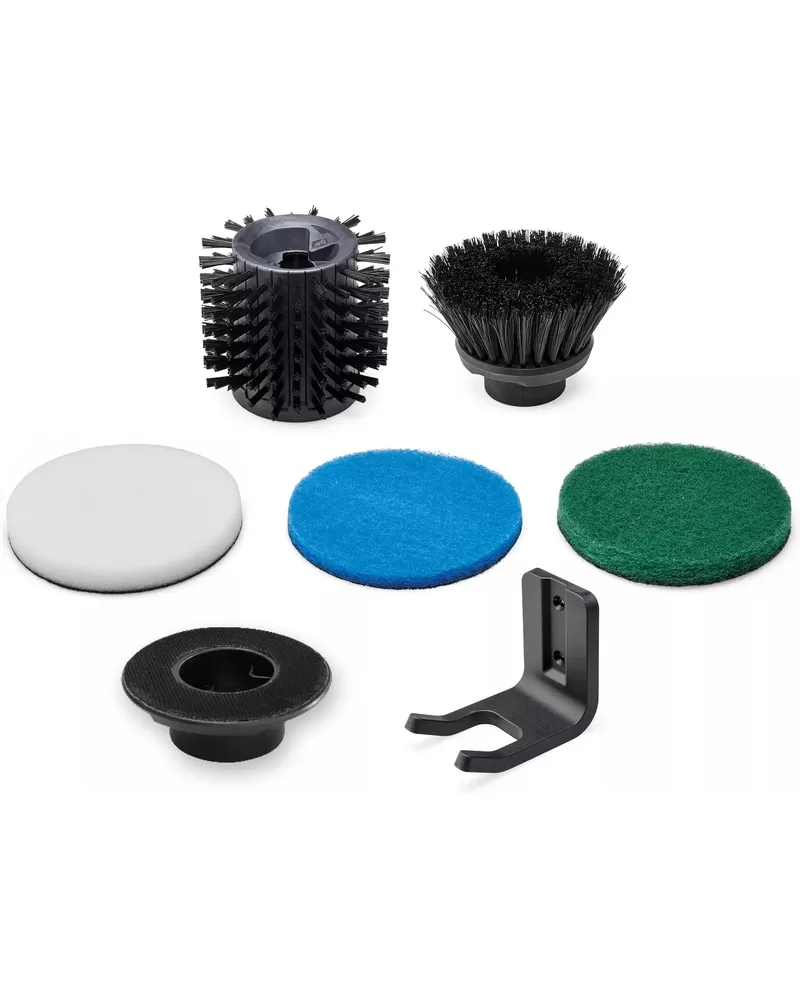 Aku povrchový kartáč PICOBELLA je vybaven mnoha doplňky. Balení obsahuje 1x kartáč SOFT 120/50 pro šetrné čištění, 1x kartáč MEDIUM 90/20 pro robustní povrchy, 3 různé čisticí podložky z melaminové pěny (stírání nečistot), mikrovlákna a kuchyňského vlákna pro hladké, citlivé a robustní povrchy, 1x držák podložek a praktický nástěnný držák pro úsporné skladování.
