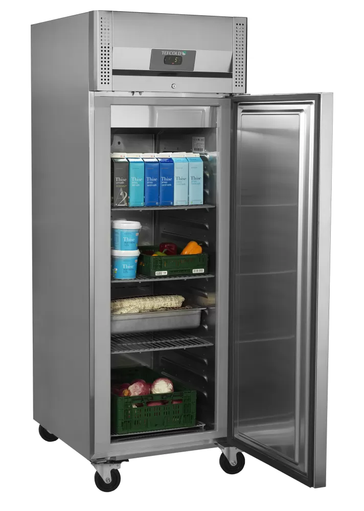 Řada chladicích skříní RK-X s 1 nebo 2 plnými dveřmi je určena pro profesionální kuchyně a má nastavitelné police o rozměrech GN2/1. Chladicí skříň je vyrobena z vysoce kvalitní nerezové oceli SS304 vhodné pro gastronomii a má odolná kolečka pro snadné přemísťování. Chlazení s ventilací zajišťuje čerstvost obsahu a teplotu lze nastavit na digitálním termostatu. Funkce Bluetooth umožňuje snadné monitorování prostřednictvím aplikace. zámek|plné dveře, lze měnit otevírání|ventilované chlazení|nastavitelné police GN 2/1|kolečka, 2 s brzdou|bezúdržbový kondenzátor|nerezové provedení|samozavírací dveře se 105° zarážkou|ovladač s funkcí Bluetooth a konektivitou NFC|export dat v souladu s HACCP Jednodveřová nerezová chladicí skříň pro profesionální kuchyně
