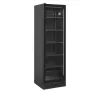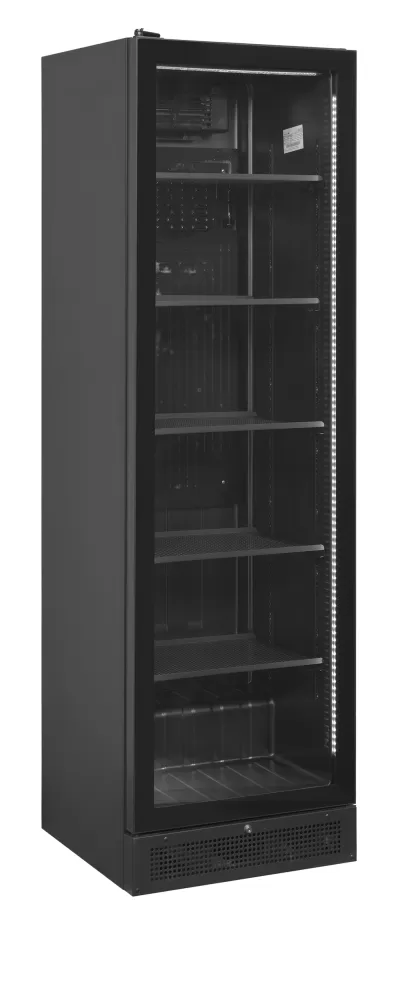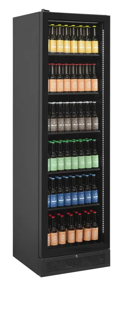 Řada chladicích skříní na nápoje SCU1425 posouvá cenově dostupné chladicí skříně na novou úroveň kvality. Černý exteriér a interiér jim dodávají elegantní nádech. Chladicí skříň má mimořádně vysoké bezrámové prosklené dveře, nastavitelné police a vnitřní osvětlení LED pro optimální prezentaci výrobků. Chladicí systém s ventilátorem zajišťuje rovnoměrné chlazení celé skříně. Standardně se dodává s pravými nebo levými křídlovými dveřmi. levé křídlové prosklené dveře|elegantní design|prosklené dveře bez rámu|černý interiér a exteriér|mimořádně vysoké prosklené dveře|vynikající prezentace produktů|vnitřní svislé a vodorovné LED osvětlení|chlazení s pomocným ventilátorem Chladicí skříň s levými křídlovými dveřmi