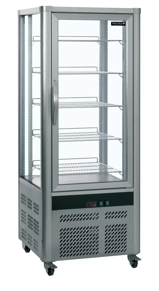 Chladicí vitrína TEFCOLD UPD 200 má všechny čtyři strany prosklené s dvojitým izolačním sklem. Výšku mezi roštovými policemi je možné změnit dle potřeby, o pojízdnost vitríny je postaráno díky 4 kolečkám, z čehož 2 jsou s brzdou. dvojité izolační sklo na čtyřech stranách|nastavitelné roštové police|prosklené dveře|hliníková povrchová úprava|pevná kolečka pro mobilitu|ventilované chlazení|vnitřní LED osvětlení Chladicí vitrína panoramatická
