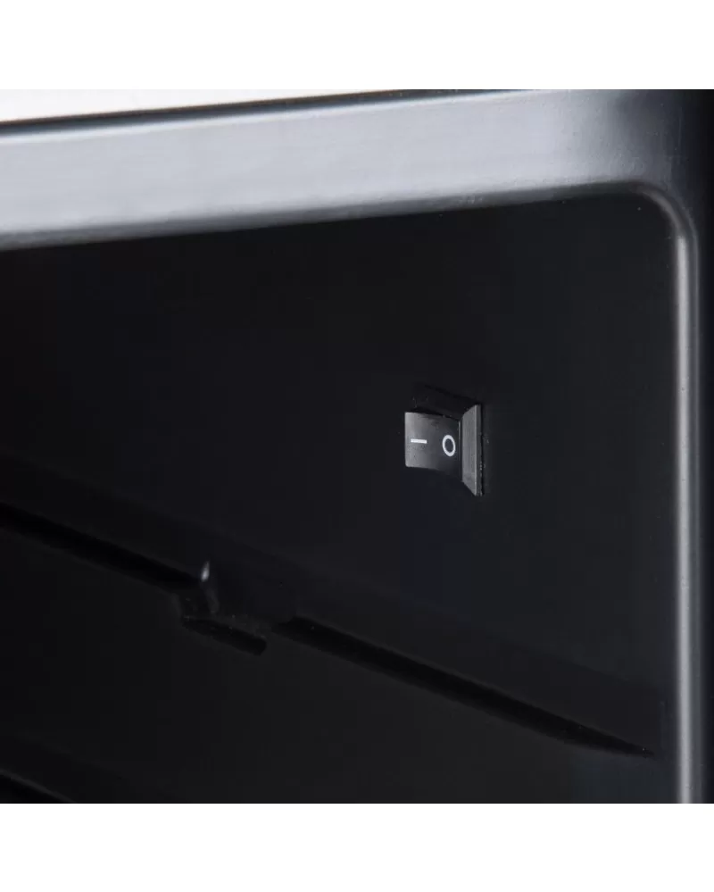 Vnitřní LED osvětlení a skleněné dveře vždy dávají přehled bez nutnosti otevírání. Stylová černá barva zapadne do každého interiéru a stane se tak perfektním doplňkem do vašeho televizního koutku, obývacího pokoje, studia i kanceláře. V případě potřeby je zde možnost přehození pantů a směru otevírání dveří.