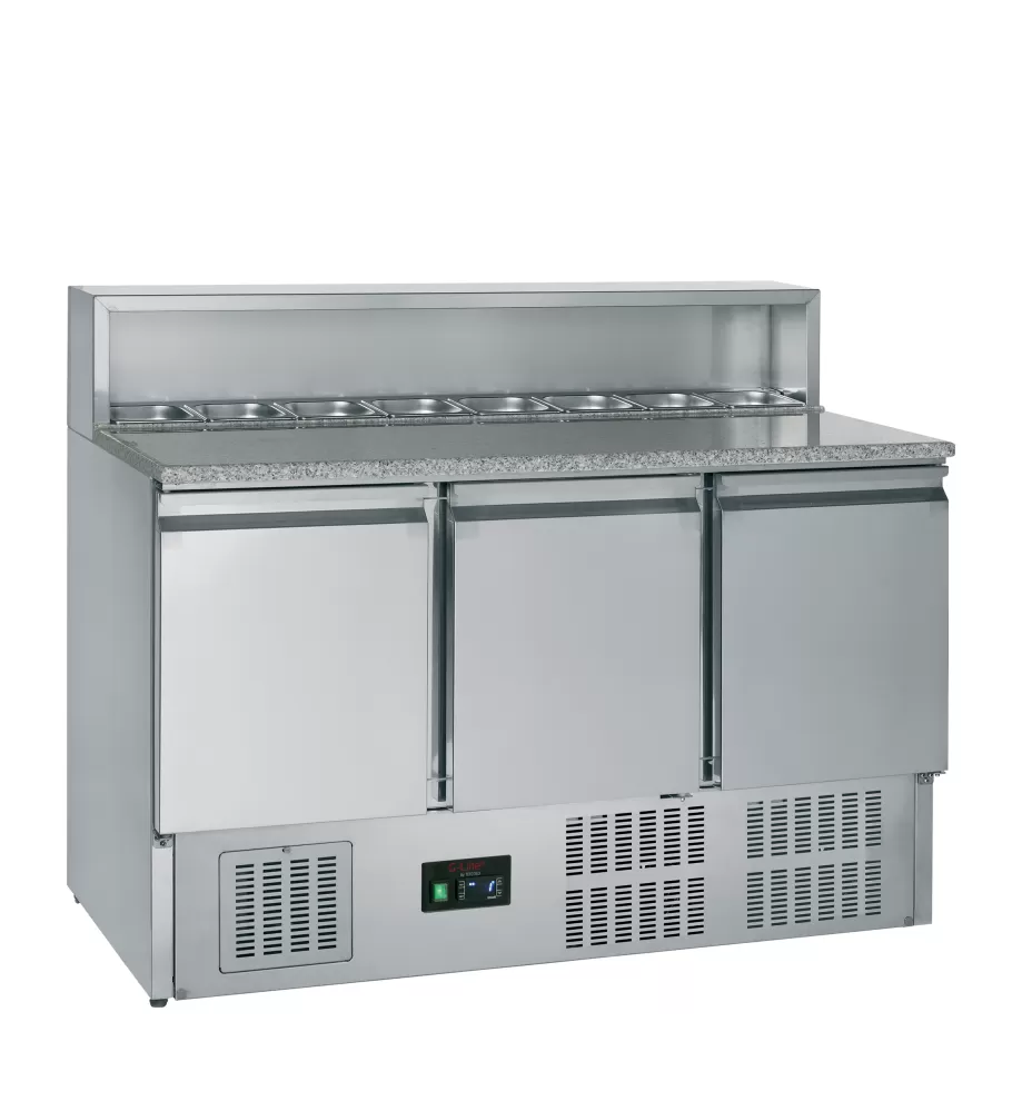 Stoly na pizzu ze série G-line jsou fantastické pro přípravu pizzy. Vše potřebné máte na dosah. Vyskládejte různé ingredience do gastronádob GN 1/6 a použijte vnitřní prostor pro skladování a snadné doplňování. Žulová deska stolu je ideální pro přípravu lahodného pizza těsta, protože zůstává chladná a těsto se tolik nelepí na desku stolu. prověřená kvalita za příznivou cenu|žulová pracovní deska|automatické odmrazování|dveře|nastavitelné nožky|nerezové provedení|chlazení s pomocným ventilátorem Chladicí pizza stůl