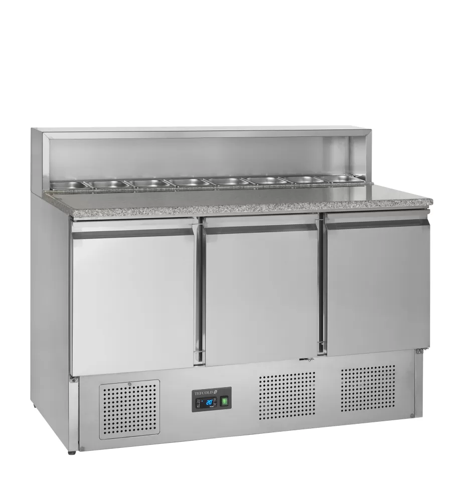 Řada PT chladicích pizza stolů je vyrobena z nerezové oceli SS304. Má žulovou desku, která je pro přípravu pizzy ideální, protože žula zůstává chladná a těsto se na ni méně lepí. Stoly jsou k dispozici v několika velikostech se 2 nebo 3 dvířky. Také je možné pořídit si přizpůsobenou variantu se zásuvkami. Ve vrchní části je možné vložit GN 1/6 x 5 ks pro model PT 920 a 8 ks GN 1/6 pro model PT 930. GN nejsou součástí. nerezová ocel|žulová pracovní deska|chladicí vana pro gastronádoby GN1/6|automatické odmrazování|dveře|nastavitelné nožky|chlazení s pomocným ventilátorem Chladicí pizza stůl GN1/1