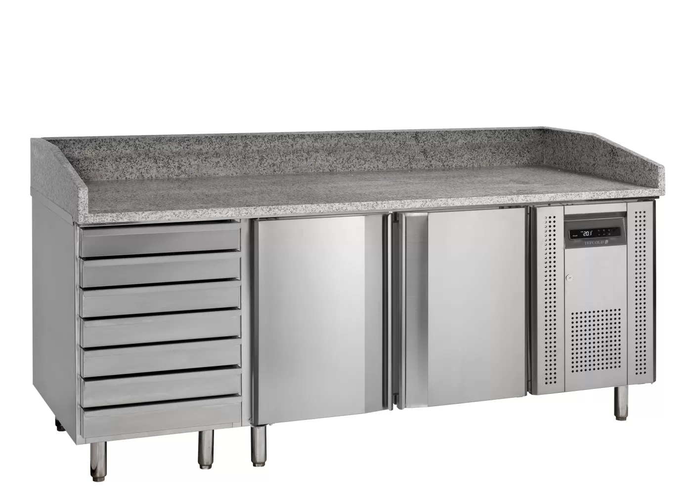 Řada PT chladicích pizza stolů je vyrobena z nerezové oceli SS304. Má žulovou desku, která je pro přípravu pizzy ideální, protože žula zůstává chladná a těsto se na ni méně lepí. Stůl je k dispozici se 2 dvířky a sadou 7 neutrálních, nechlazených zásuvek na levé straně. Také je možné pořídit si přizpůsobenou variantu se se zásuvkami 1/2 + 1/2 (kód12526). Chladicí pizza stoly mohou být dodávány buď v kompletu s chladicí nástavbou pro GN 1/3 x 150 mm (nejsou součástí) nebo samostatně bez nástavby. nový design|nerezová ocel|sekce neutrálních zásuvek|zásuvy pro 7 táců na pizzu v každých dveřích (400 × 600 mm)|žulová pracovní deska|ventilované chlazení|automatické odmrazování|samozavírací dveře Chladicí pizza stůl s oddělením na těsto v okolní teplotě
