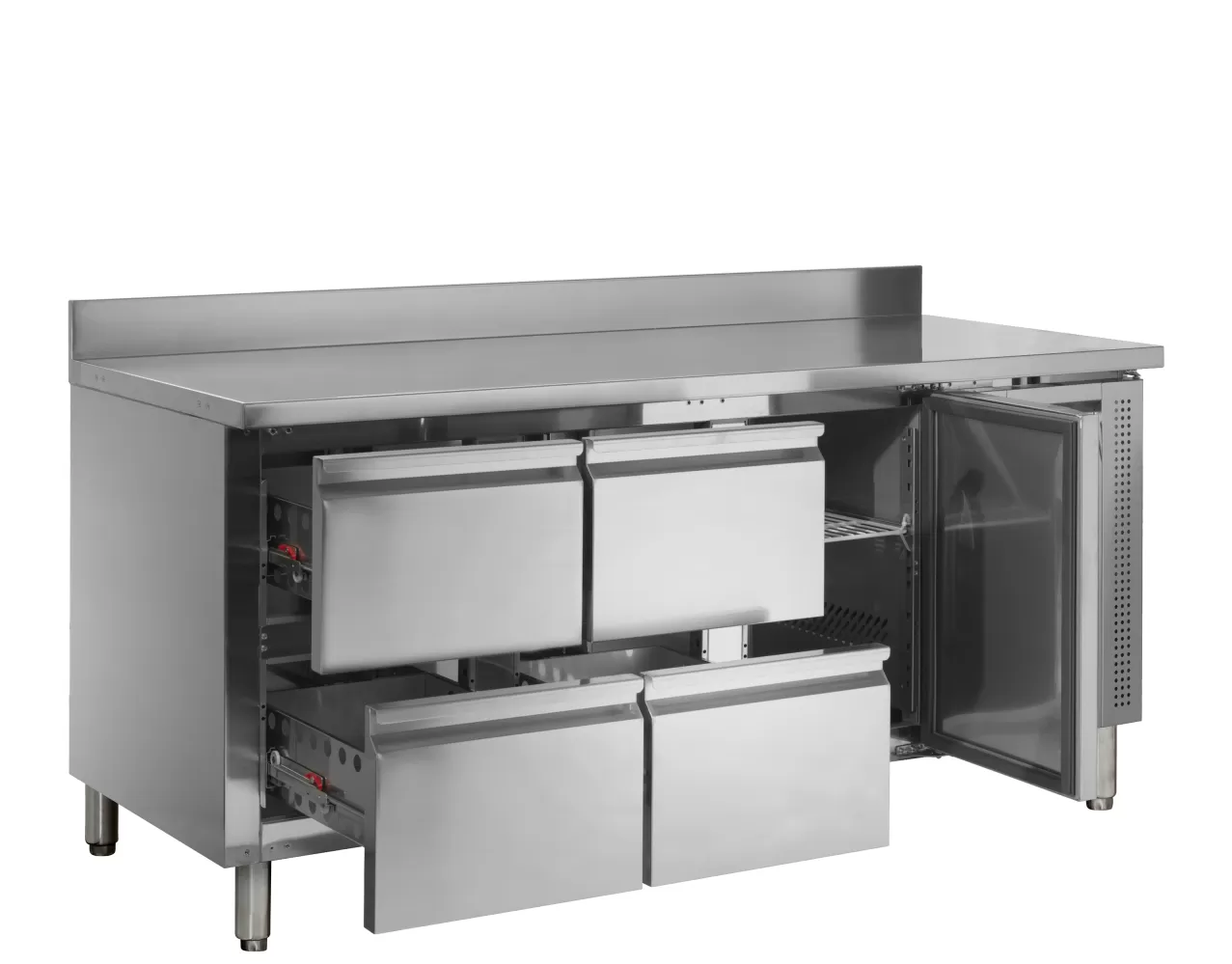 Řada chladicích stolů CK z nerezové oceli SS304 je určena pro profesionální kuchyně, a proto má rozměry GN1/1. Stoly jsou k dispozici v několika velikostech a můžete si vybrat mezi plnými dvířky a zásuvkami. Dále máte výběr mezi modely s odnímatelnou horní deskou se zadní deskou, nebo bez ní. Všechny mají ventilované chlazení, které zajišťuje rovnoměrnou a stálou teplotu. nerezová ocel|automatické odmrazování|odstranitelná pracovní deska se zadním lemem|digitální termostat a teplotní displej|nastavitelná police GN 1/1|zásuvky GN 1/1|nastavitelné nohy|ventilované chlazení Chladicí stůl se zásuvkami a policemi GN1/2