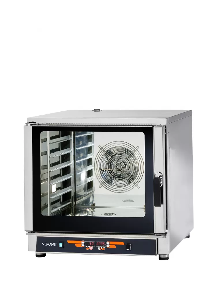 Digitální konvekční (horkovzdušná) pec s přivlhčováním a regulací páry 10 až 100 %. Díky páře nedochází k vysoušení produktů, je zachována jejich šťavnatost. U pečení pečiva má pára vliv na rovnoměrnou strukturu a následně jeho kvalitu. V sérii NORDline Nerone MID je počet roštů (600 x 400 mm) nebo GN 1/1 dán číslem v názvu za "MID". Rošty ani GN nejsou součástí. Pod troubu je možné pořídit také podstavec z nerezové oceli s protiskluzovými nožkami a zásuvy na rošty nebo plechy. vývin páry s nástřikem|regulace páry 10 až 100 %|kombinovaný režim (kombinace pečení a páry)|napojení na vodovodní řád a odpad|ventilátor s opačným systémem proudění vzduchu|dokonalý ventilační systém – rovnoměrná distribuce tepla|teplotní sonda|delta T pečení|nerezové opláštění a vnitřek trouby + masivní rukojeť|dvojité prosklené dveře|snadná údržba a čištění - lehce vyměnitelné těsnění, vyjímatelné vnitřní lišty, zaoblené vnitřní hrany|zámkový systém|vnitřní osvětlení|digitální ovládání|termostat 280 °C|spolehlivost garantována evropskou výrobou|kapacita 6 x GN 1/1 nebo rošt 600 x 400 mm (nejsou součástí ceny)|vzdálenost mezi rošty - 80 mm Digitální konvekční (horkovzdušná) pec