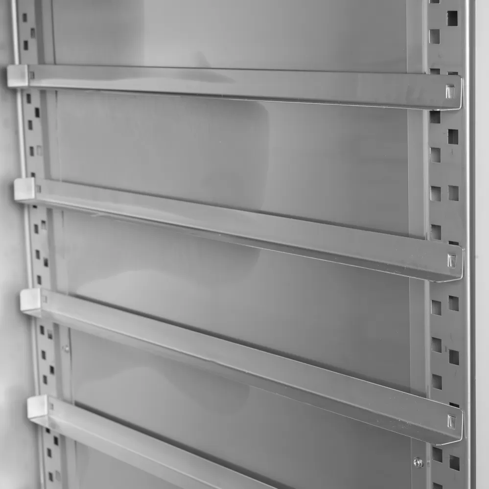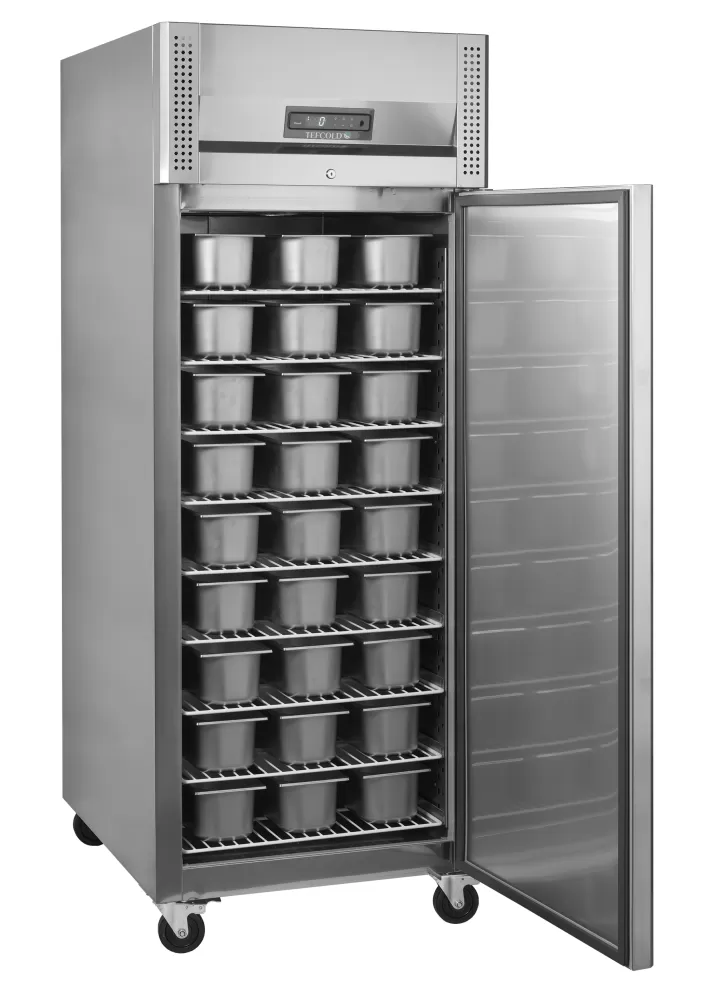 Řada mrazicích skříní BF je navržena s rozměry Euronorm a má 9 vodicích lišt pro pekařské plechy o rozměrech 600 × 400 nebo 600 x 800 mm, což usnadňuje organizaci a přístup. Tento konkrétní model je navíc vybaven policemi, které pojmou až 54 GN na zmrzlinu 360x165x120 mm o objemu 5 l, čímž se rozšiřuje jeho všestrannost. rozměry podle evropské normy|9 drátěné police (600 x 800 mm)|pojme 54 x 5l gastronádoby (gastronádoby nejsou součástí balení).|samozavírací dveře, lze měnit otevírání|nerezová ocel 304|vnitřní LED osvětlení|ventilované chlazení|odolná kolečka|zámek Všestranná mrazicí skříň pro skladování pečiva/zmrzliny