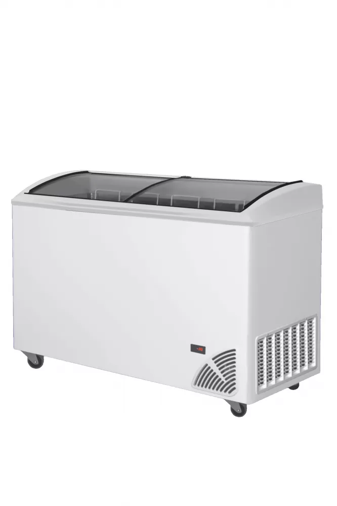 Prosklené mrazničky Byfal jsou k dostání ve třech bravách: červená, šedá, bíla a ve dvou provedeních: s rovným víkem a oblým víkem. Vyznačují se vynikajícími izolačními vlastnostmi. Vnější plášť je vyroben z pozinkovaného plechu, ten je z vnější strany potažen PVC, což jej činí odolnější proti korozi a poškrábání. Vnitřní stěny mrazničky jsou z Alu plechu o čistotě 99 % mimo dna, to je vyrobeno z ocelového plechu s povrchovou úpravou pro styk s potravinami. Vrchní krytí je z tvrzeného skla s termickou vrstvou,která zajistí lepší izolaci.Víko je opatřeno zámkem. Kompresor řídí digitální termostat s displejem, který znázorňuje aktuální teplotu. Ve standardní výbavě se nachází plný počet košů, do kterých je možno objednat dělící přepážky pro rozdělení mražených potravin. statické chlazení|vestavěný agregát|manuální odmrazování|digitální termostat s teploměrem|síla izolace stěny - 65 mm|bílé opláštění, uvnitř ALU|koše jsou součástí|zámek|kolečka Pultová mraznička s posuvným oblým víkem a digitálním termostatem s teploměrem