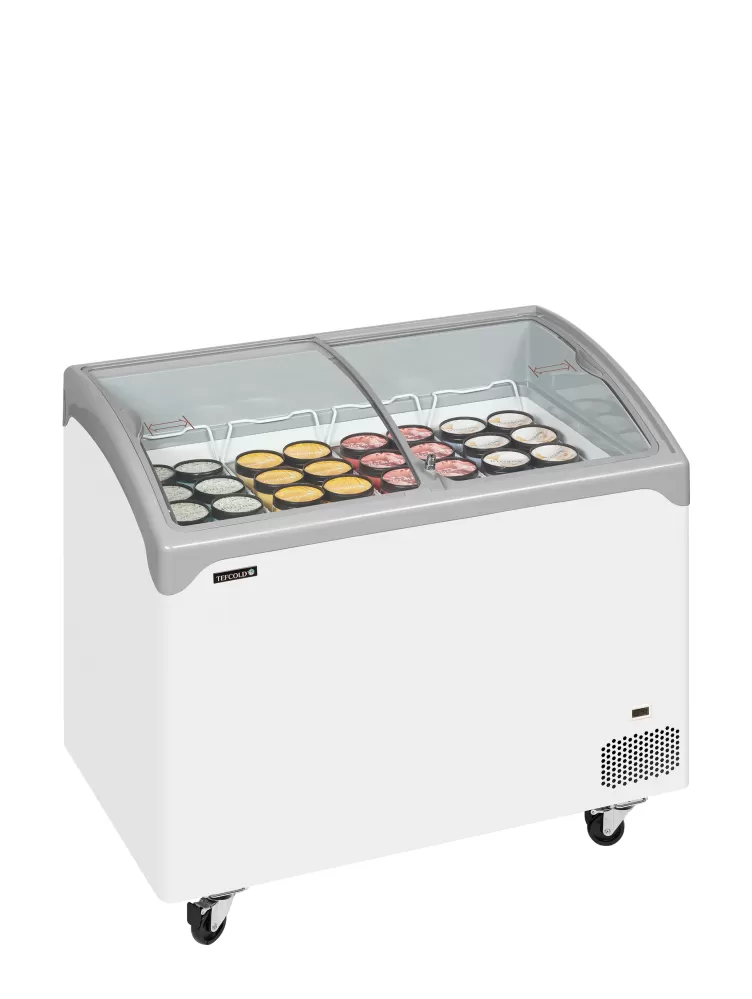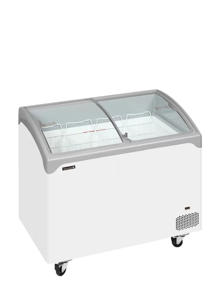 Prémiová řada pultových mrazniček NIC-SCEB má skvělý design se zaoblenými šedými rohy a hranami a oblými posuvnými prosklenými víky. Má velmi stabilní a pevnou konstrukci a navíc je vybavena kolečky, takže s ní lze snadno manipulovat a přesouvat ji po provozovně. Mraznička se skvěle hodí k vystavování mražených potravin včetně zmrzliny. Dodává se s kompletní sadou košů, nejmenší model NIC 101 SCEB obsahuje systém dělících přepážek. náklon výstavní plochy pro lepší prezentaci|zahrnuje plnou sadu košů|oblá posuvná víka se zámkem|ideální pro reklamní polep|digitální teploměr|kolečka s brzdou|klimatická třída 5 - vysoký výkon i v teplém prostředí Pultová mraznička s proskleným oblým víkem