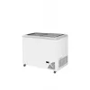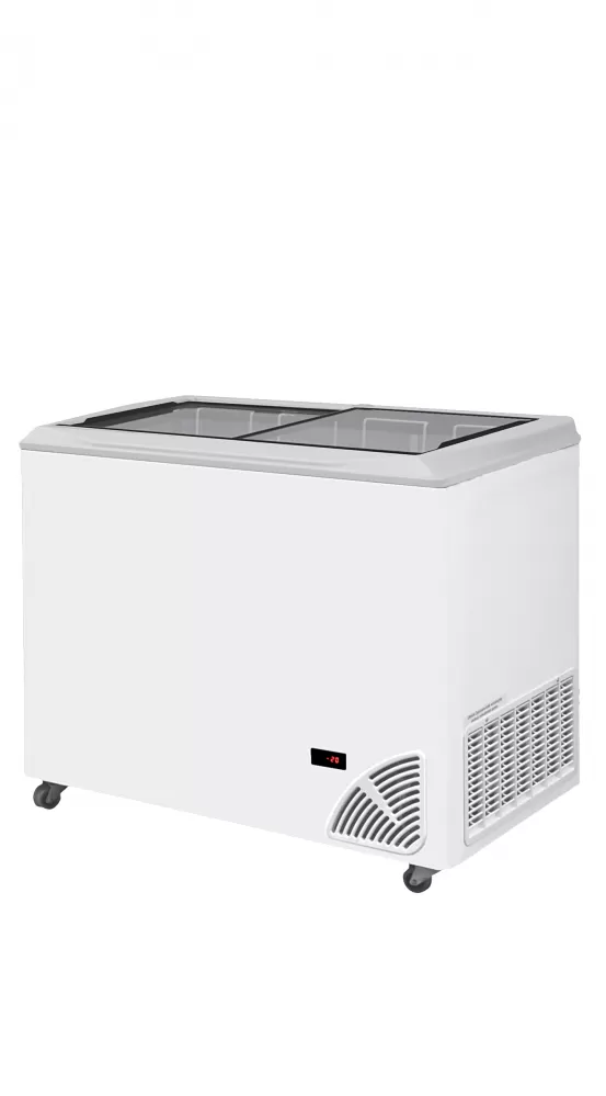 Prosklené mrazničky Byfal jsou k dostání ve třech bravách: červená, šedá, bíla a ve dvou provedeních: s rovným víkem a oblým víkem. Vyznačují se vynikajícími izolačními vlastnostmi. Vnější plášť je vyroben z pozinkovaného plechu, ten je z vnější strany potažen PVC, což jej činí odolnější proti korozi a poškrábání. Vnitřní stěny mrazničky jsou z Alu plechu o čistotě 99 % mimo dna, to je vyrobeno z ocelového plechu s povrchovou úpravou pro styk s potravinami. Vrchní krytí je z tvrzeného skla s termickou vrstvou,která zajistí lepší izolaci.Víko je opatřeno zámkem. Kompresor řídí digitální termostat s displejem, který znázorňuje aktuální teplotu. Ve standardní výbavě se nachází plný počet košů, do kterých je možno objednat dělící přepážky pro rozdělení mražených potravin. statické chlazení|vestavěný agregát|manuální odmrazování|digitální termostat s teploměrem|síla izolace stěny - 65 mm|bílé opláštění, uvnitř ALU|koše jsou součástí|zámek|kolečka Pultová mraznička s posuvným rovným víkem a digitálním termostatem s teploměrem