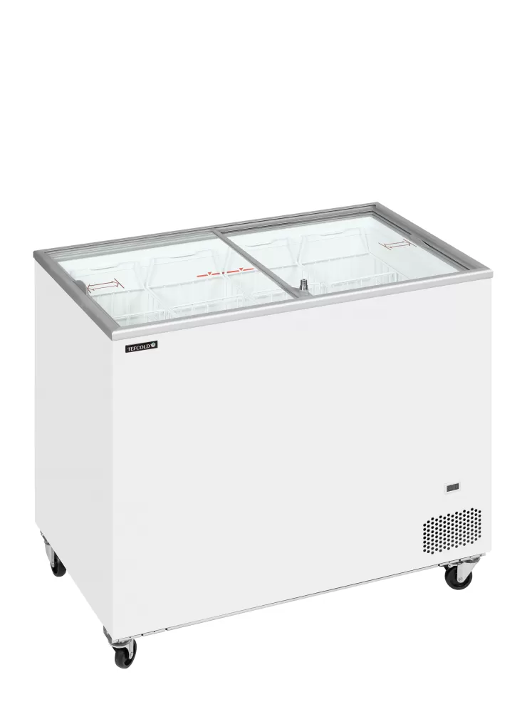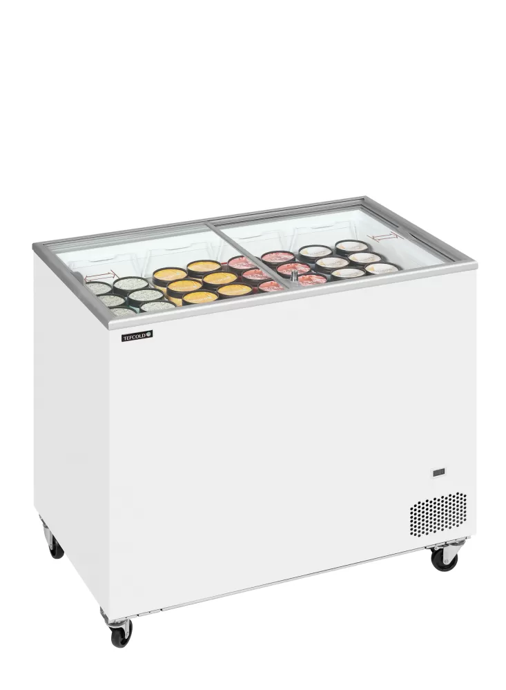 Standardní řada pultových mrazniček IC nabízí stabilní a spolehlivě konstruované zařízení za příznivou cenu. Dodává se s rovnými prosklenými posuvnými víky pro lepší viditelnost produktů a s kompletní sadou košů připravených k naplnění např. lahodnou zmrzlinou. zahrnuje plnou sadu košů|rovná posuvná prosklená víka se zámkem|ideální pro reklamní polep|digitální teploměr|vnitřní opláštění bílá lakovaná ocel|kolečka s brzdou|klimatická třída 5 - vysoký výkon i v teplém prostředí Pultová mraznička s proskleným rovným víkem