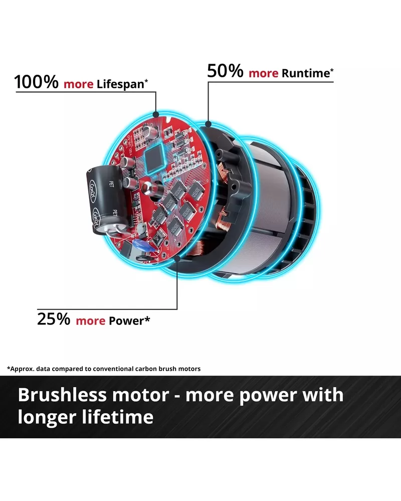 • Bezkartáčový motor – větší výkon a delší doba chodu.