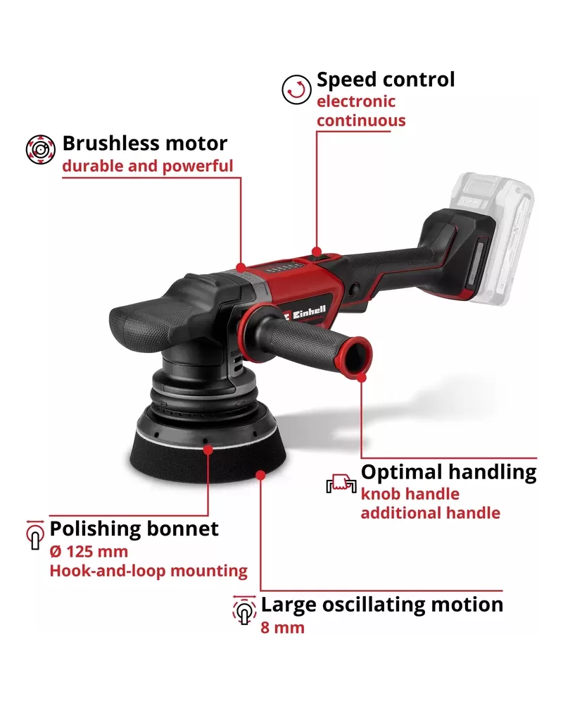 • Akumulátorová excentrická leštička Einhell Professional CP-EP 18/125 Li BL-Solo je nezbytností pro profesionální péči o vozidlo.