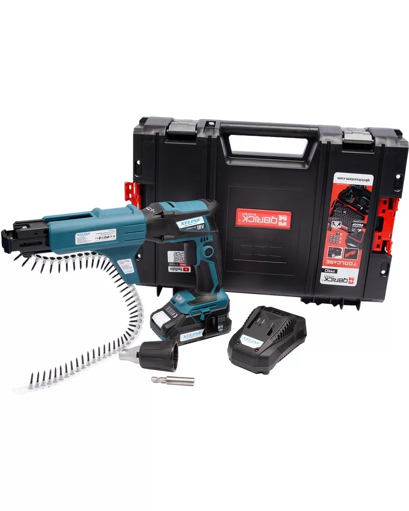 Disponuje zásobníkem na vruty, který umožňuje rychlé upevňování desek bez nutnosti manuálního podávání vrutů.