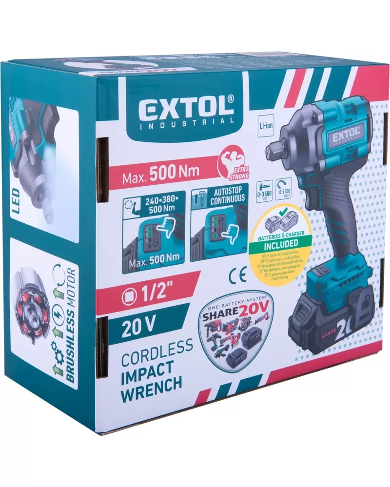 Aku utahovák rázový 1/2" 20V/2,0Ah SHARE20V, 500Nm, BRUSHLESS EXTOL INDUSTRIAL 8791814