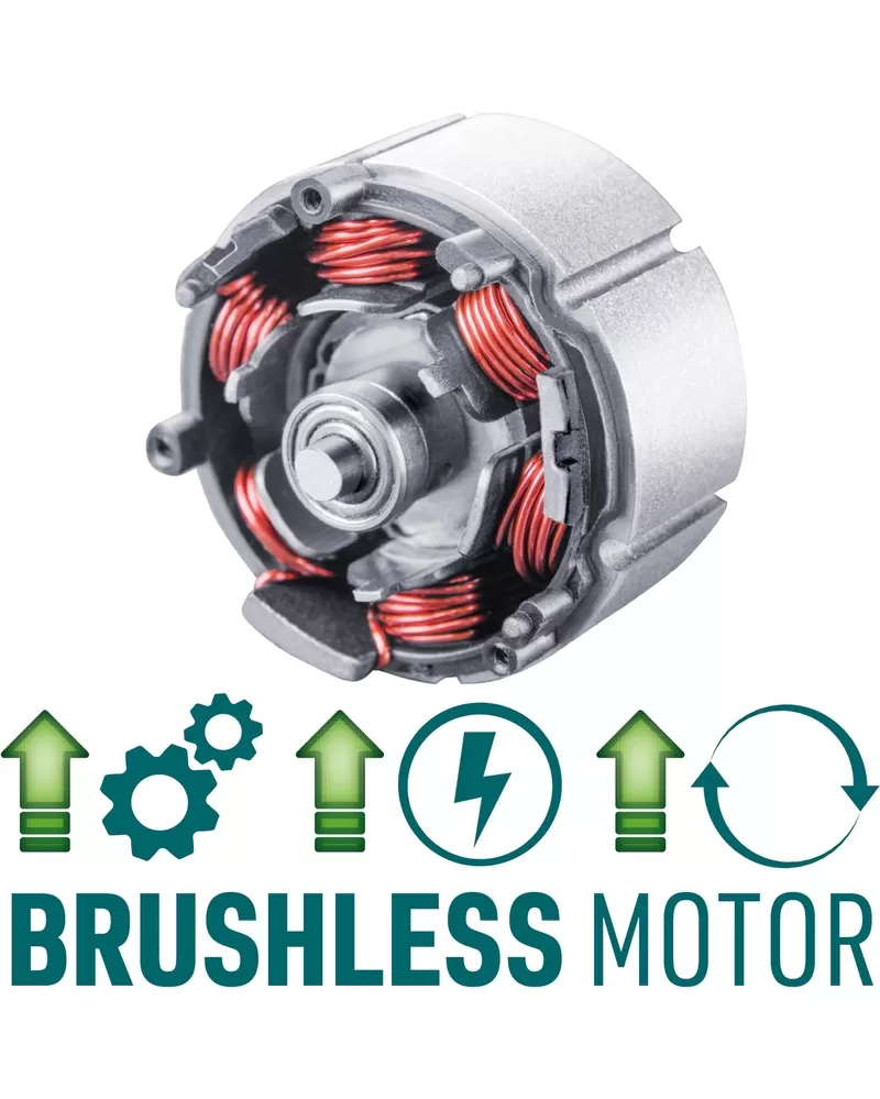 • Pohání ho nejmodernější „brushless" motor, který má vyšší životnost, je výkonnější a má menší spotřebu energie než klasické motory s uhlíkovými kartáči.