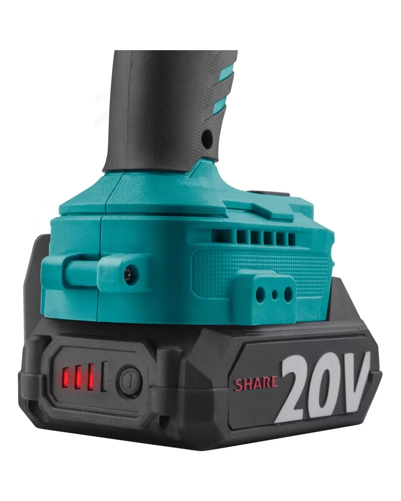 • Mezi další přednosti patří LED svítilna s dosvitem, kovová přezka pro zavěšení, rukojeť kompletně pokrytá gumou a použití univerzálních akumulátorů SHARE20V.
