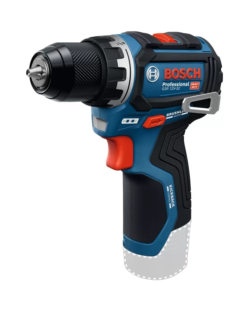Další informace: GSR 12V-32 Professional je vybaven funkcí Advanced KickBack Control, bezuhlíkovým motorem, robustním kovovým sklíčidlem, jasným pracovním světlem a sponou na opasek.