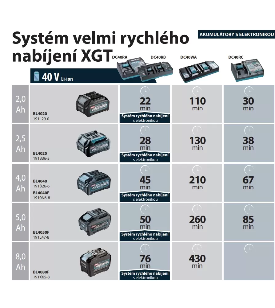 • Duální nabíječka pro dvě 40V XGT baterie s digitální komunikací mezi nabíječkou a baterií