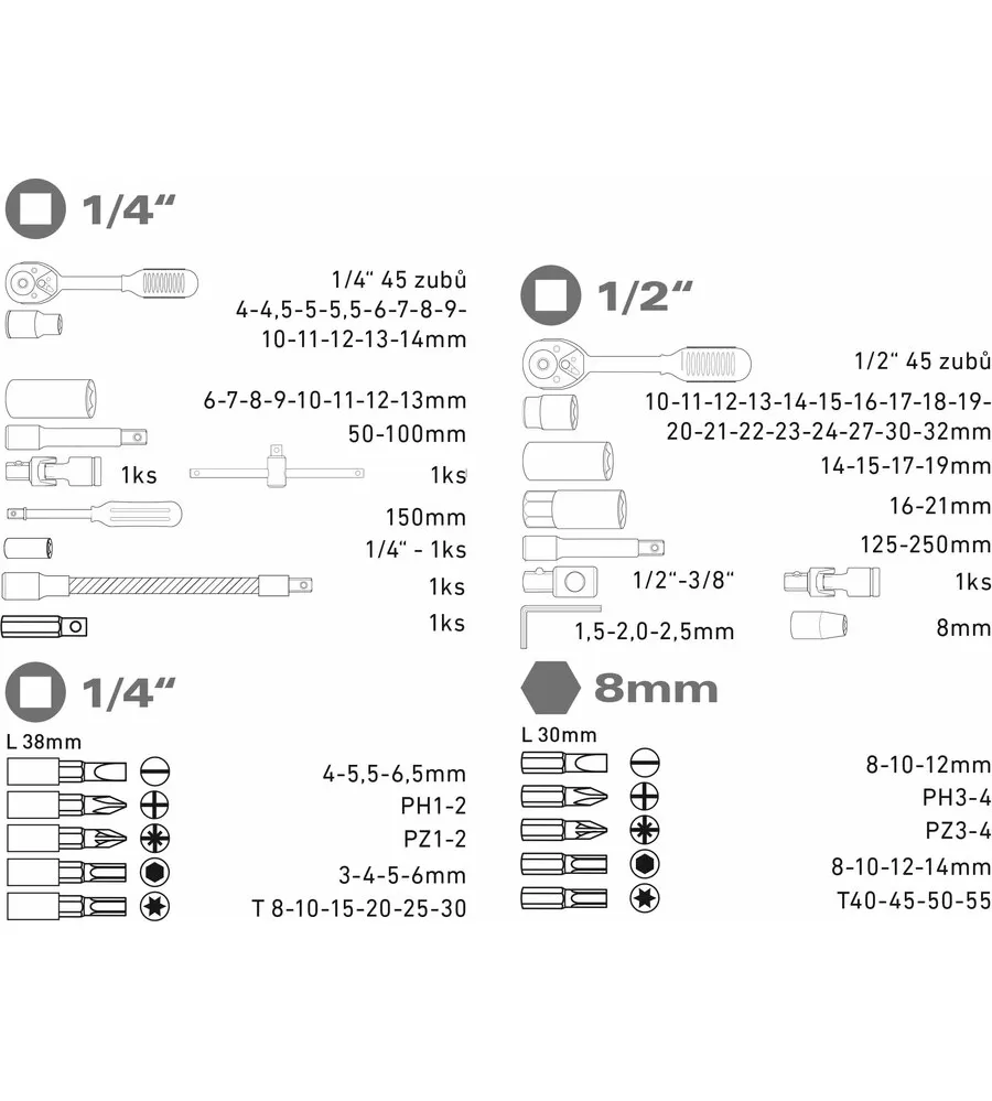 • Sada obsahuje nástroje s upínacím rozměrem 1/4" a 1/2".