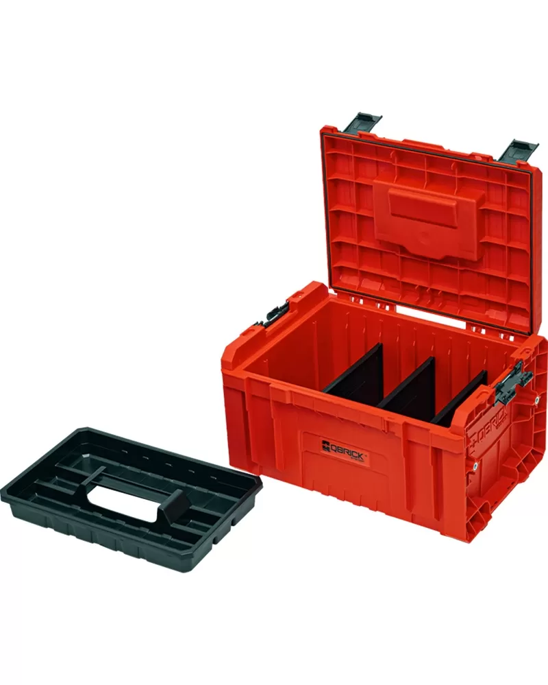 Qbrick System PRO Toolbox představuje prostorný a praktický modulární box na nářadí, který již ve své základní výbavě nabízí rozsáhlé možnosti organizace. Vybaven je pružným těsněním integrovaným ve víku, které zajišťuje zvýšenou ochranu proti prachu a vodě (stupeň krytí IP54). Vnitřní prostor je rozčleněn pomocí tří nastavitelných přihrádek a jedné velké úložné části. K připojení dalších modulů slouží mimořádně odolné boční a čelní konektory z kvalitního polyamidu. Uvnitř boxu jsou integrována speciální vodítka, která umožňují upevnění organizérů Qbrick System TWO Multi nebo Qbrick System PRO Multi, určených pro ukládání drobného dílenského vybavení a příslušenství.