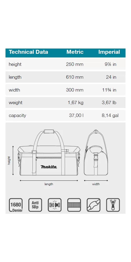 Víceúčelová velká cestovní taška pro pohodlné nošení a přepravu těžších předmětů a nářadí Přední kapsa na zip pro snadný přístup ke všem nezbytnostem Moderní design s rolovací vrchní částí Nastavitelné protiskluzové popruhy a polstrovaná ramenní vycpávka Velmi odolná konstrukce