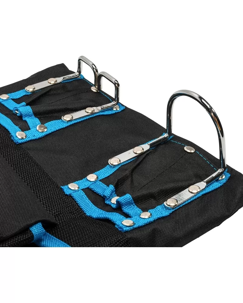 Pouzdro na nářadí o rozměru 300x250 mm obsahuje 2 velké kapsy, 6 menších kapes, držák na kleště a držák na kladivo.