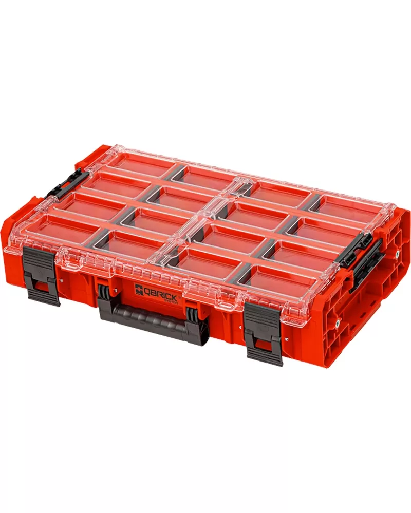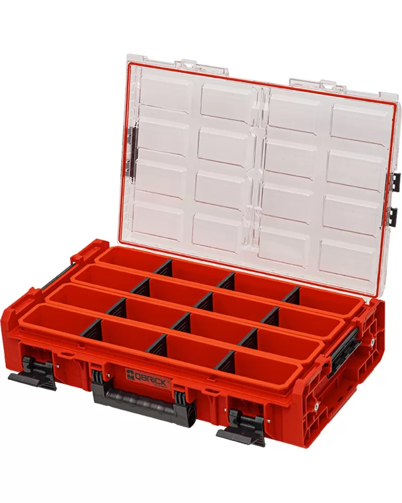 Organizér je vyroben z ultra odolného plastu RED ULTRA HD, odolává mechanickému poškození i nízkým teplotám. Je vybaven čtyřmi podlouhlými kontejnery, z nichž každý obsahuje tři vyjímatelné přepážky, umožňující flexibilní uspořádání vnitřního prostoru. Díky průhlednému polykarbonátovému víku s těsněním poskytuje organizér ochranu proti prachu a vodě (IP66). Boční konektory umožňují propojení s dalšími moduly systému Qbrick ONE.