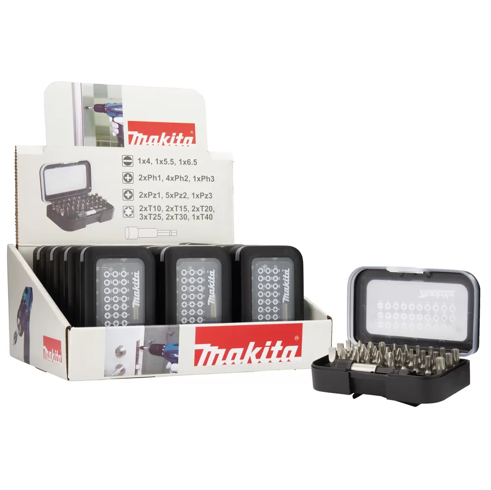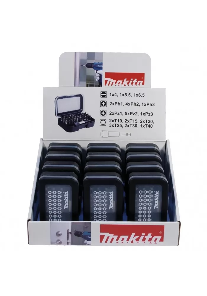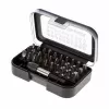 Sada bitů 31 ks v plastové krabičce s klipem na opasek. Sada obsahuje 30 bitů 1/4" v délce 25 mm: 2x PH1, 4x PH2, PH3, 2x PZ1, 5x PZ2, PZ3, 2x T10, 2x T15, 2x T20, 3x T25, 2x T30, T40, plochý 4, 5.5, 6.5 mm a magnetický držák bitů s pojistkou proti nechtěnému vypadnutí bitu.