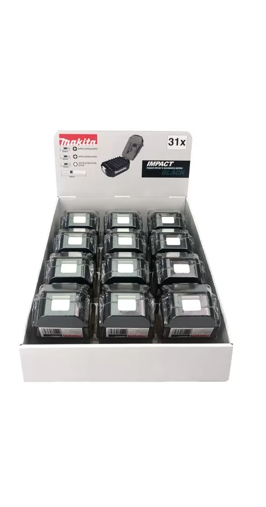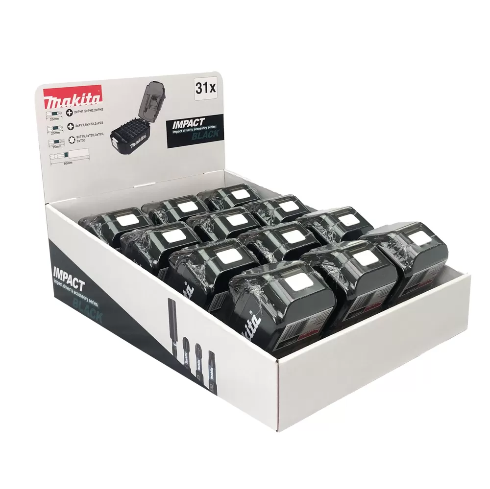 Sada 12 ks sad ve tvaru baterie. Každá sada obsahuje 30 ks bitů Impact Black o délce 25 mm - PH1 (2 ks), PH2(5 ks), PH3 (2 ks), PZ1 (2 ks), PZ2 (5 ks), PZ3 (2 ks), T15 (3 ks), T20 (3 ks), T25 (3 ks), T30 (3 ks) a držák bitů 60 mm. 12 ks sad v balení.