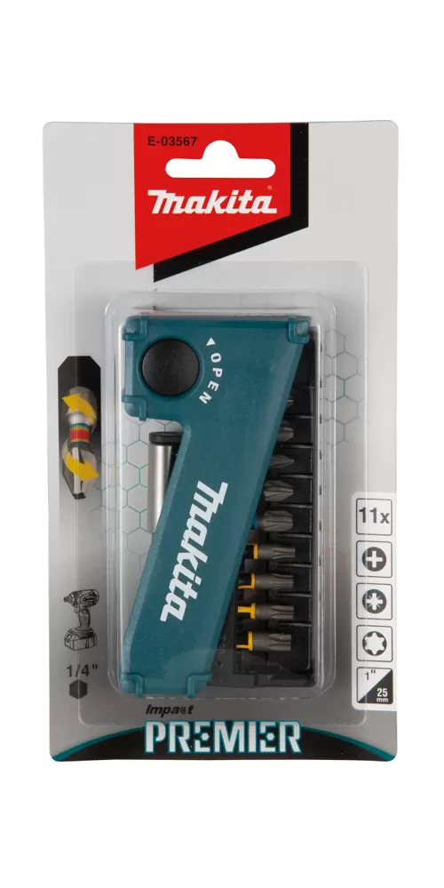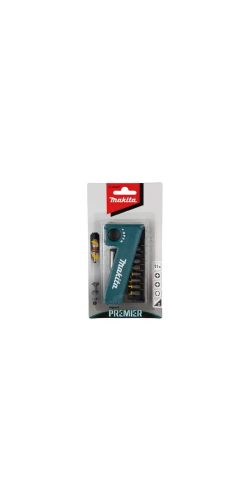 Sada obsahuje bity Premier PH1, PH2, PH3, PZ1, PZ2, PZ3, T15, T20, T25, T30 a držák bitů 50 mm.