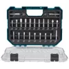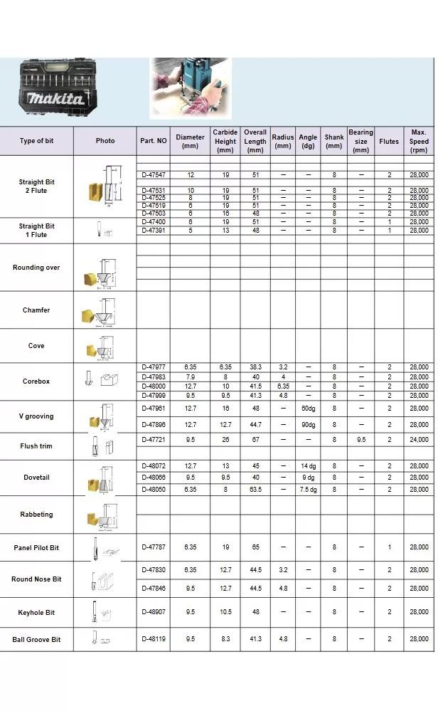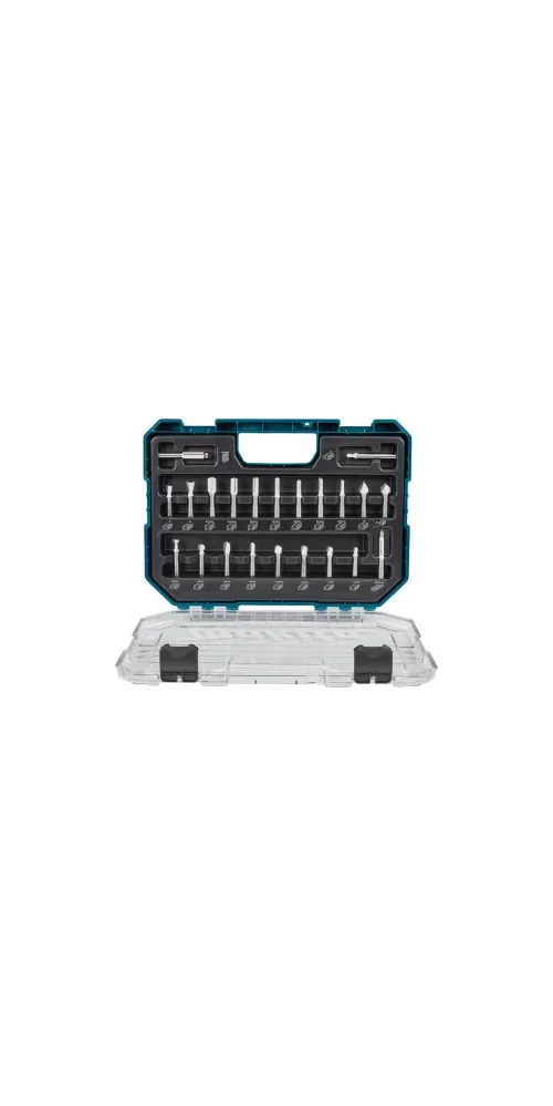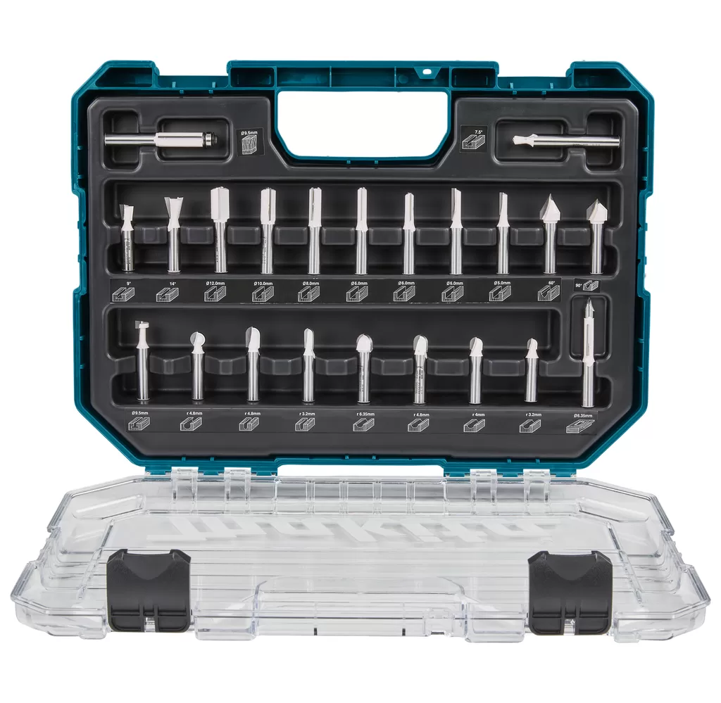 Sada fréz 22 ks v čirém plastovém pouzdře s průhledným víkem a průměrem stopky 8 mm. Maximální rychlosti jsou uvedeny na zadní straně pro každou frézu. Sada obsahuje: drážkovací fréza 2 břity 12 x 19 mm - 10 x 19 mm - 8 x 19 mm - 6 x 19 mm - 6 x 16 mm, drážkovací fréza 1 břit 6 x 19 mm - 5 x 13 mm, fréza na dutý profil 6.35 x 6.35 mm R3.2 - 7.9 x 8 mm R4 - 12.7 x 10 mm R6.35 - 9.5 x 9.5mm R4.8 - 6.35 x 12.7 mm R3.2 - 9.5 x 12.7mm R4.8, V-drážka fréza 12.7 mm 60gr - 12.7 mm 90gr, hranová fréza 9.5 mm, rybinová fréza 12.7 mm - 9.5 mm 9.5 mm, vrták 6.5 mm - 6.3 mm fréza, fréza na klíčové dírky 9.5 mm, kulová fréza 9.5 mm R4.8