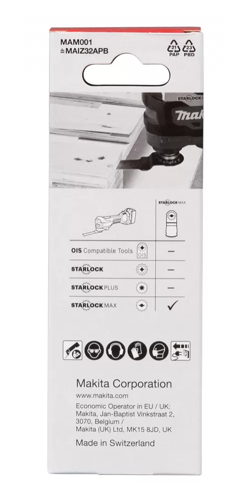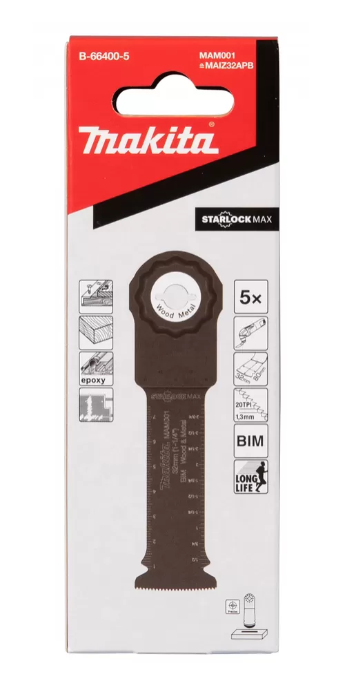 Ponorný pilový list MAM001 má 32 mm široký a 80 mm hluboký řezný list a má obzvláště dlouhou životnost. Vhodné pro přesné ponorné řezy do dřeva a kovu. S držákem Starlock Max pro maximální přenos síly a rychlou výměnu kotouče. Balení 5 ks.