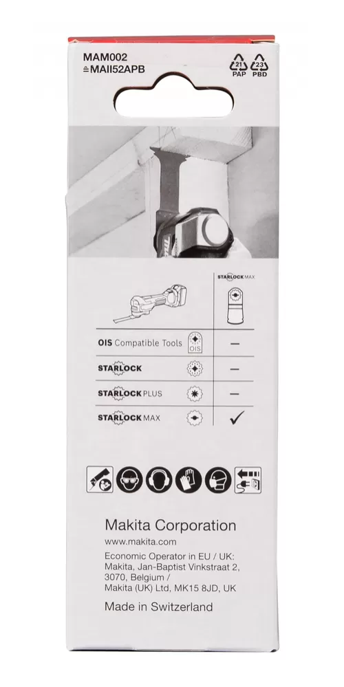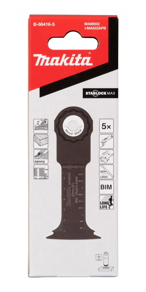 Ponorný pilový list MAM002 má 52 mm široký a 70 mm hluboký,list má obzvláště dlouhou životnost. Vhodné pro přesné ponorné řezy do kovu. S držákem Starlock Max pro maximální přenos síly a rychlou výměnu kotouče. Balení 5 ks.