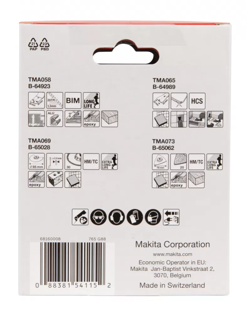 Sada obsahuje pilový list rovný 20 x 30 mm BiM B-64923, škrabku 52 x 26 mm HCS B-64989, pilový kotouč s tvrdokovem 85 mm G30 B-65028 a brusnou desku s tvrdokovem 78 mm B-65062.