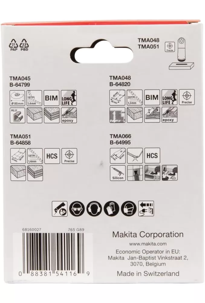 Sada obsahuje pilový kotouč 85 mm BiM B-64799, pilový list rovný 65 x 40 mm BiM B-64820, pilový list rovný 32 x 50 mm HCS B-64858 a škrabku 52 x 40 mm HCS B-64995.