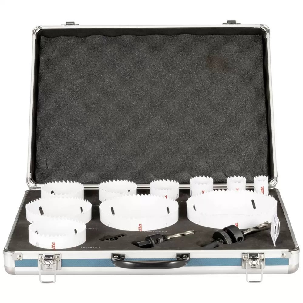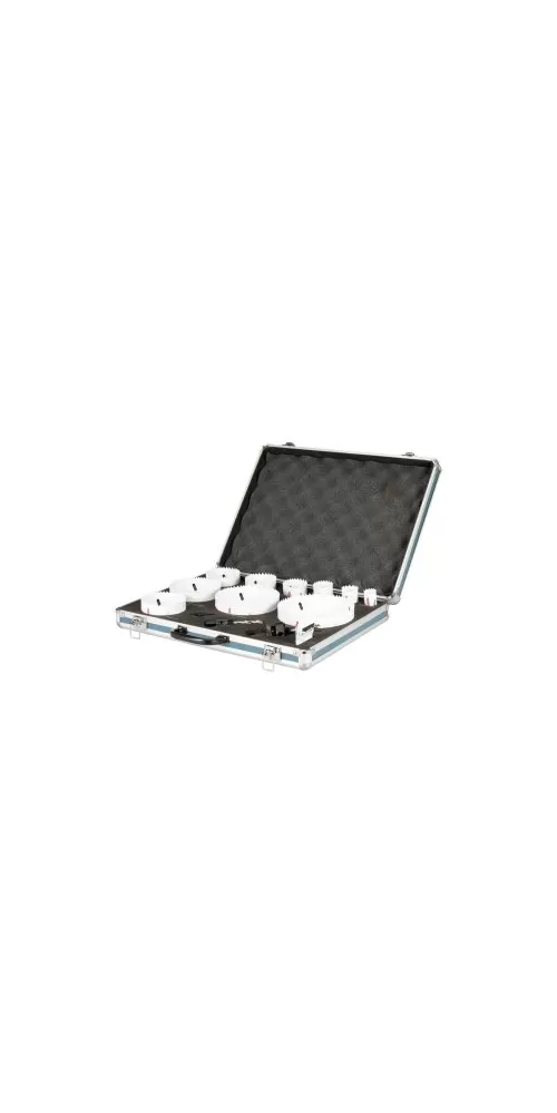 Sada obsahuje děrovky 22 mm, 29 mm, 35 mm, 44 mm, 57 mm, 64 mm, 76 mm, 92 mm, 111 mm a 127 mm, adaptéry 9.5 a 11 mm a středící vrták. Dodávka je v hliníkovém kufru.