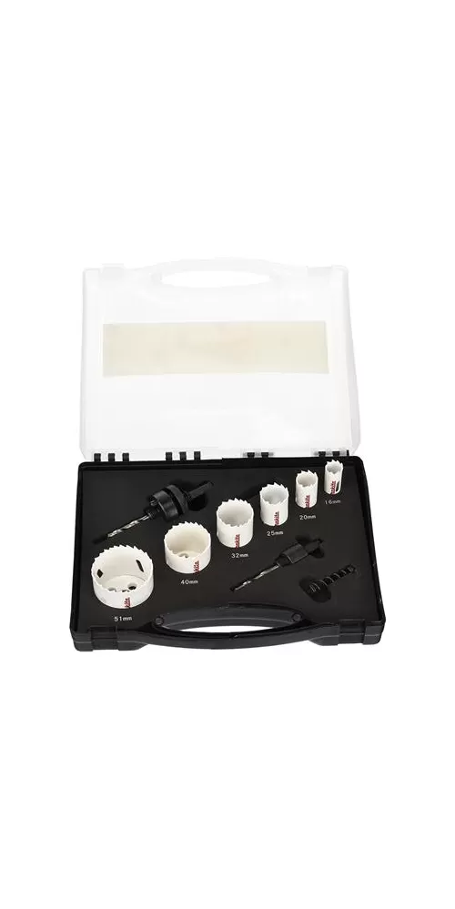 Sada vrtacích korunek o rozměrech 16, 20, 25, 32, 40 a 51 mm. Součástí balení jsou 2 adaptéry: 6hran 1/4" 14–30 mm a 6hran 1/4" 32–152 mm