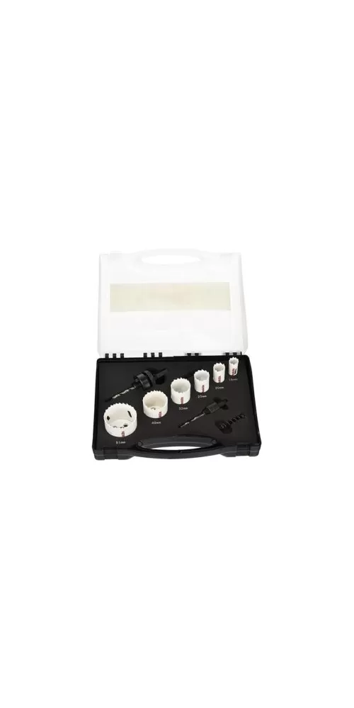 Sada vrtacích korunek o rozměrech 16, 20, 25, 32, 40 a 51 mm. Součástí balení jsou 2 adaptéry: 6hran 1/4" 14–30 mm a 6hran 1/4" 32–152 mm Celý popis