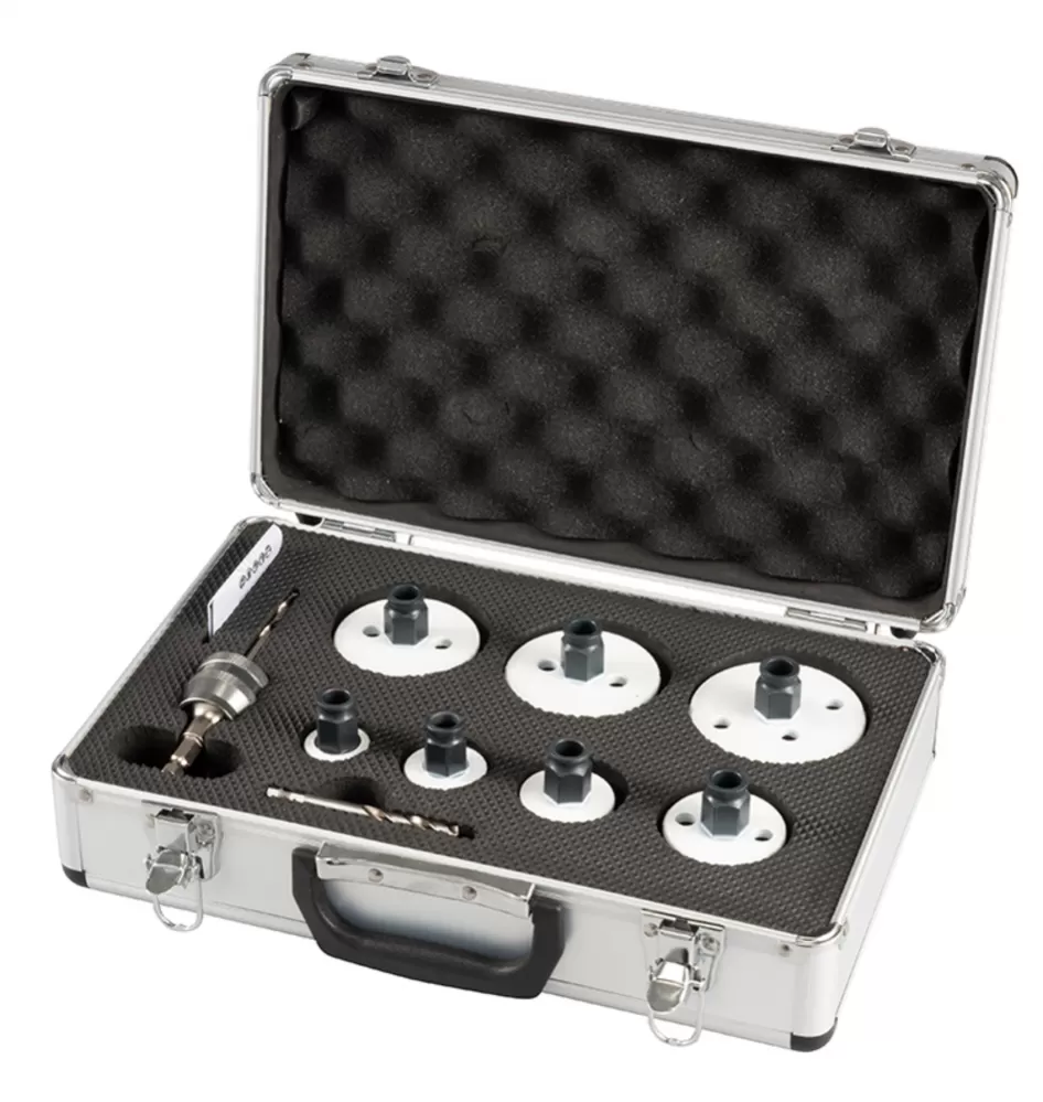 Sada v hliníkovém kufru obsahuje děrovky Ezychange2 o průměru 19, 22, 29, 38, 44, 57 mm a adaptér se středícím vrtákem HSS-G.