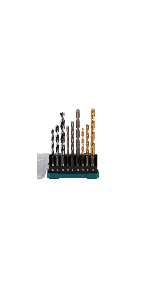 Sada obsahuje vrtáky s válcovou stopkou do zdiva 5, 6 a 8 mm, do dřeva 5, 6 a 8 mm a do kovu HSS-TiN 5, 6 a 8 mm. Sada je dodávaná v plastové krabičce.