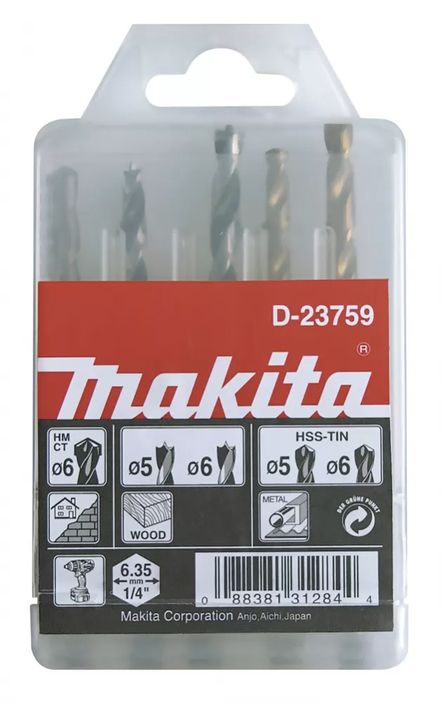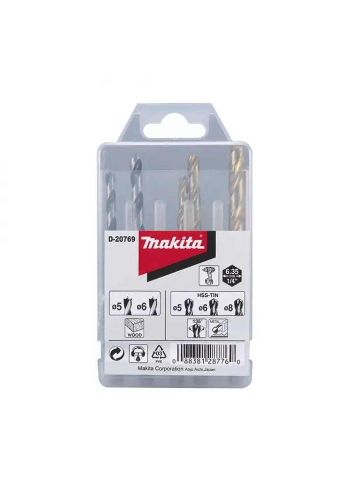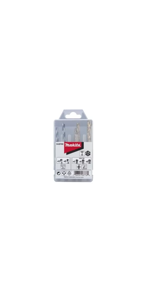 Sada vrtáků do kovu, dřeva a zdiva. Tato sada vrtáků má upnutí HEX 1/4" - šestihran velikosti bitu. Jsou tedy vhodné i pro upnutí do rázových šroubováků. Vrtáky do dřeva 5 a 6 mm, vrtáky do kovu HSS-Tin 5 a 6 mm, vrták do zdiva 6 mm