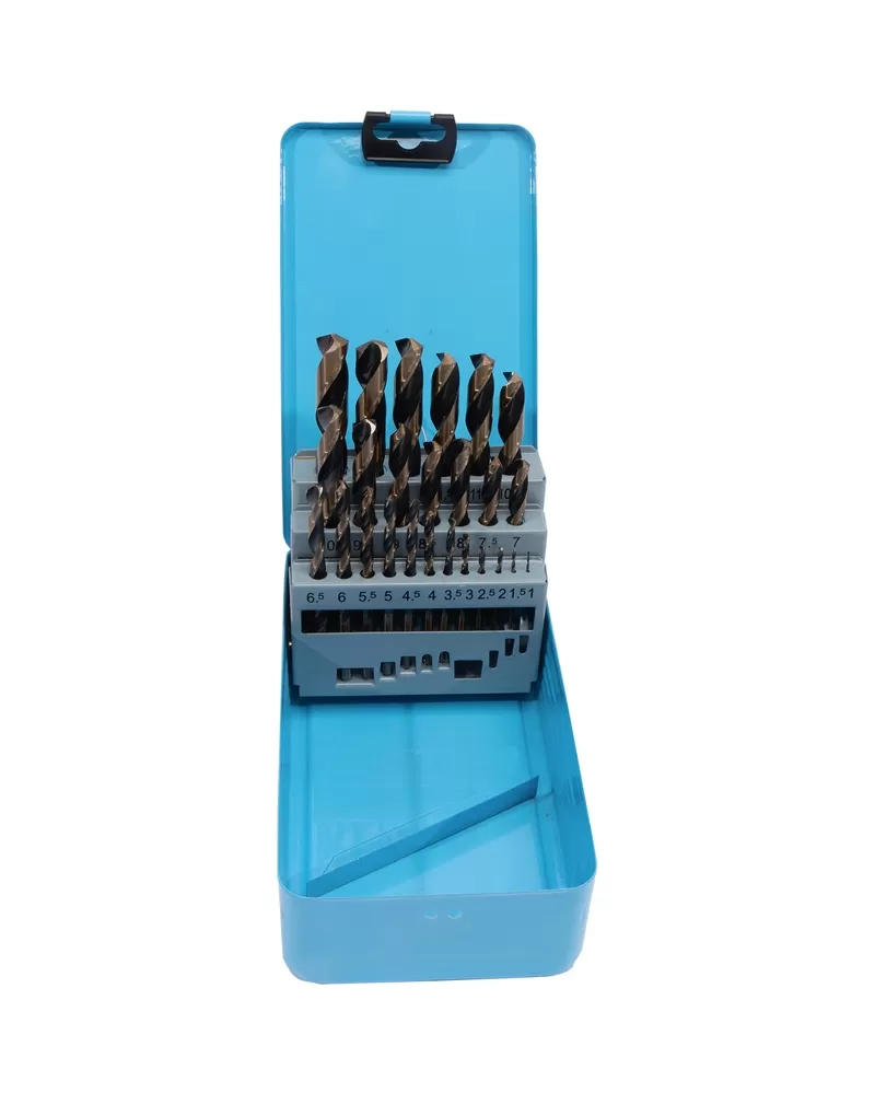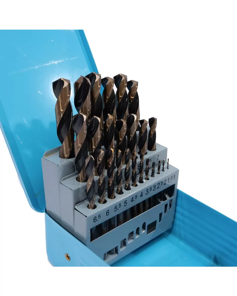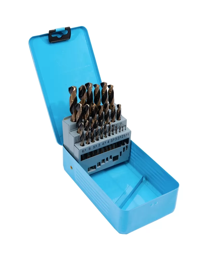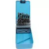 Sada vrtáků do kovu vyrobených z HSS oceli. Vrtáky jsou uloženy v kovovém boxu. Lze opětovně brousit.