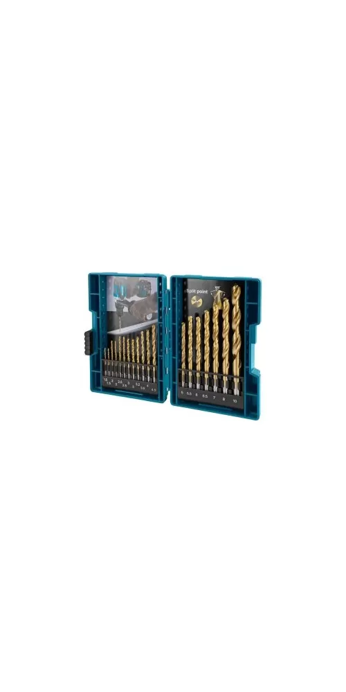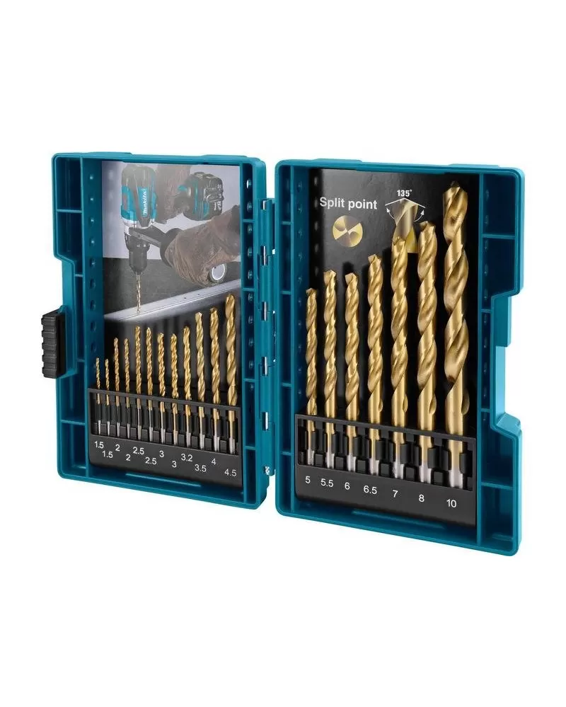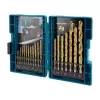 Sada 19 ks vrtáků HSS-TiN 1.5 mm (2 ks), 2 mm (2 ks), 2.5 mm (2 ks), 3 mm (2 ks), 3.2 mm, 3.5 mm, 4 mm, 4.5 mm, 5 mm, 5.5 mm, 6 mm, 6.5 mm, 7 mm, 8 mm a 10 mm v praktickém plastovém boxu.