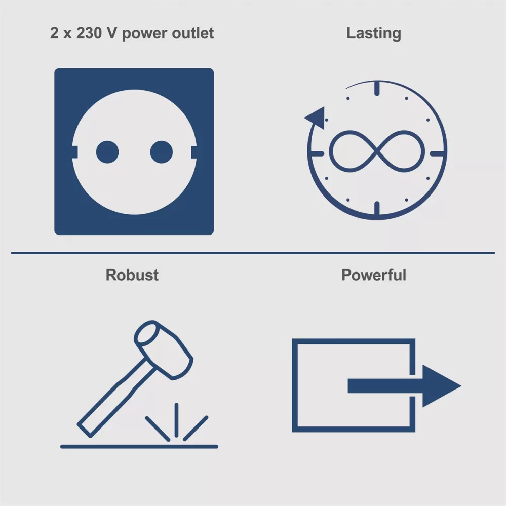 Trvalý výkon 2500 W již dává uživateli možnost napájet nejenom elektrospotřebiče odporového typu (žárovky, topná tělíska, kávovary ap.), ale i celou škálu elektrospotřebičů indukčního typu, u kterých je nutné počítat s větší výkonovou rezervou kvůli rozběhu a ztrátám ve vinutí elektromotoru při provozu (ruční el. nářadí, el. čerpadla, stroje s většími elektromotory ap.).