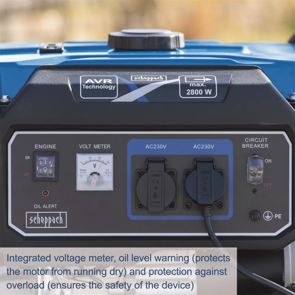 Pro kvalitu elektrocentrály je klíčovým prvkem motor a alternátor. Scheppach používá jen kvalitní motory a alternátory prověřené v dlouhodobých zátěžových testech, které jsou vybaveny špičkovým napájením s automatickou regulací AVR (Automatic Voltage Regulator), takže nepoškodí ani spotřebiče náročnější na kvalitu napájecího proudu. Kvalitní vinutí zase zaručuje delší životnost a lepší elektrickou vodivost. Velká nádrž 15 l s ukazatelem paliva dovolí uživateli mnohahodinový bezstarostný provoz, ochranný ocelový rám chrání centrálu před poškozením a kola spolu s přepravními madly výrazně ulehčují transport stroje. Ve výbavě nechybí ani voltmetr, dvě zásuvky na 230 V, ochrana proti přetížení a kontrola nízké hladiny oleje.